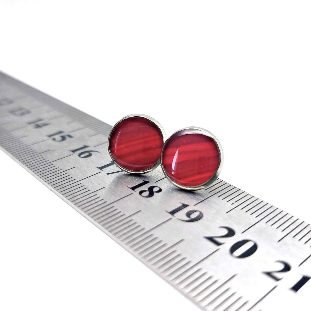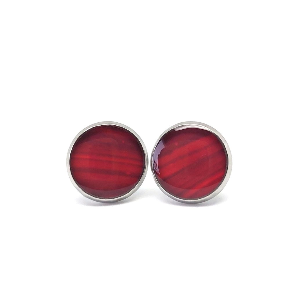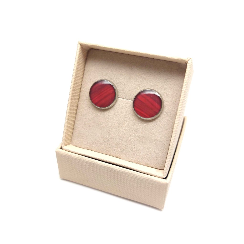 Červené malované pecky z chirurgické oceli - motiv náušnic vznikl metodou acrylic pouring (lití akrylu). Výsledek této techniky je pokaždé jiný, šperky tak jsou jedinečné, nikdo nebude mít stejné jako vy. Motiv je zalitý pryskyřicí, která vypadá jako sklo, ale je mnohem lehčí.