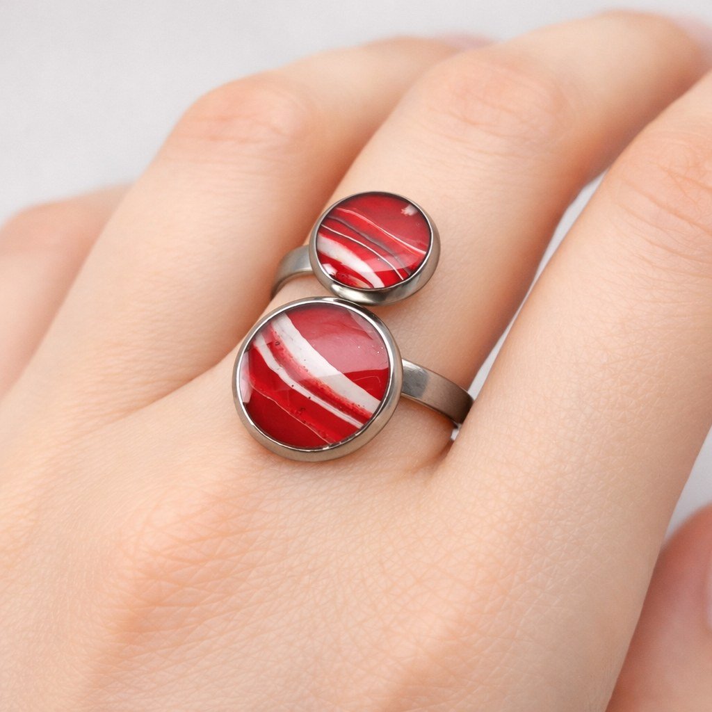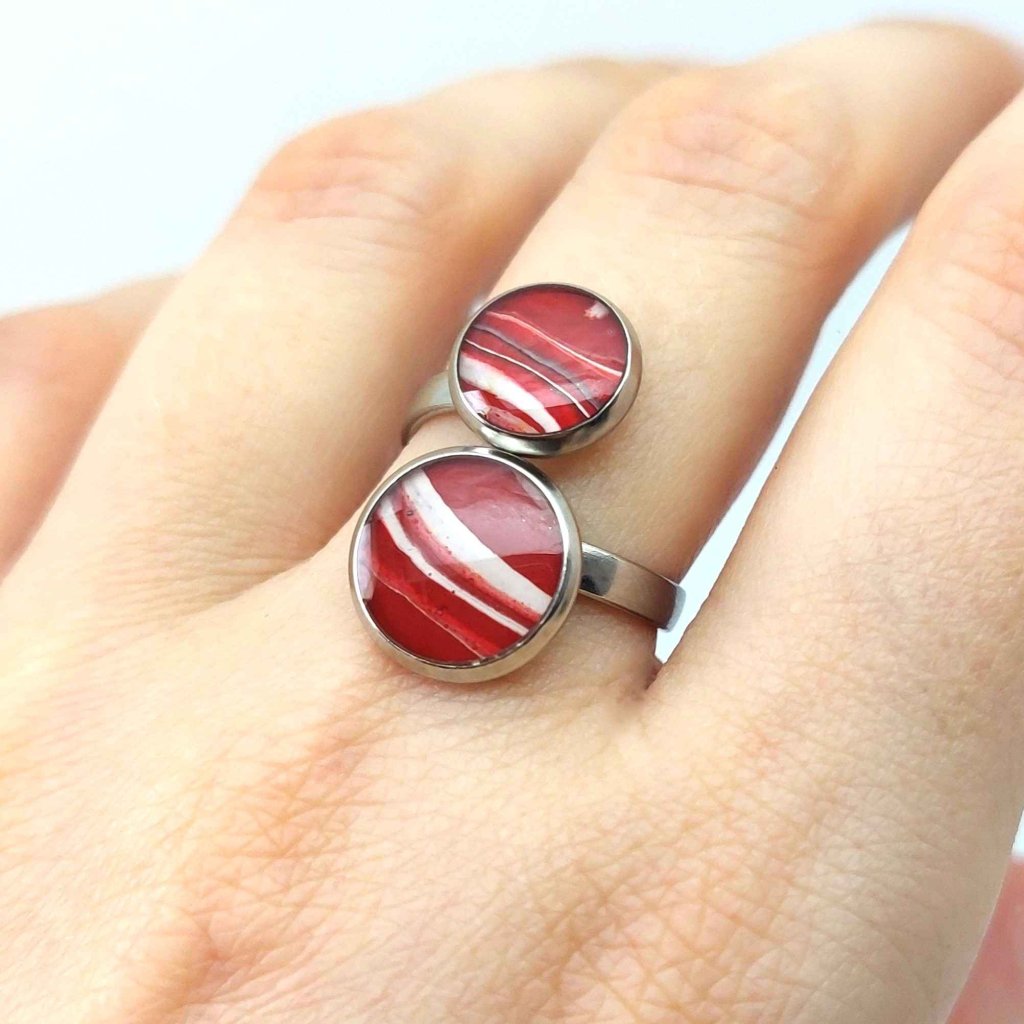 Ručně vyrobený dvojitý červený prstýnek s malovaným vzorem zalitým pryskyřicí. Abstraktní motiv jedinečný, nikdo nebude mít přesně takový prstýnek jako vy. Velikost si můžete upravit, je nastavitelná.