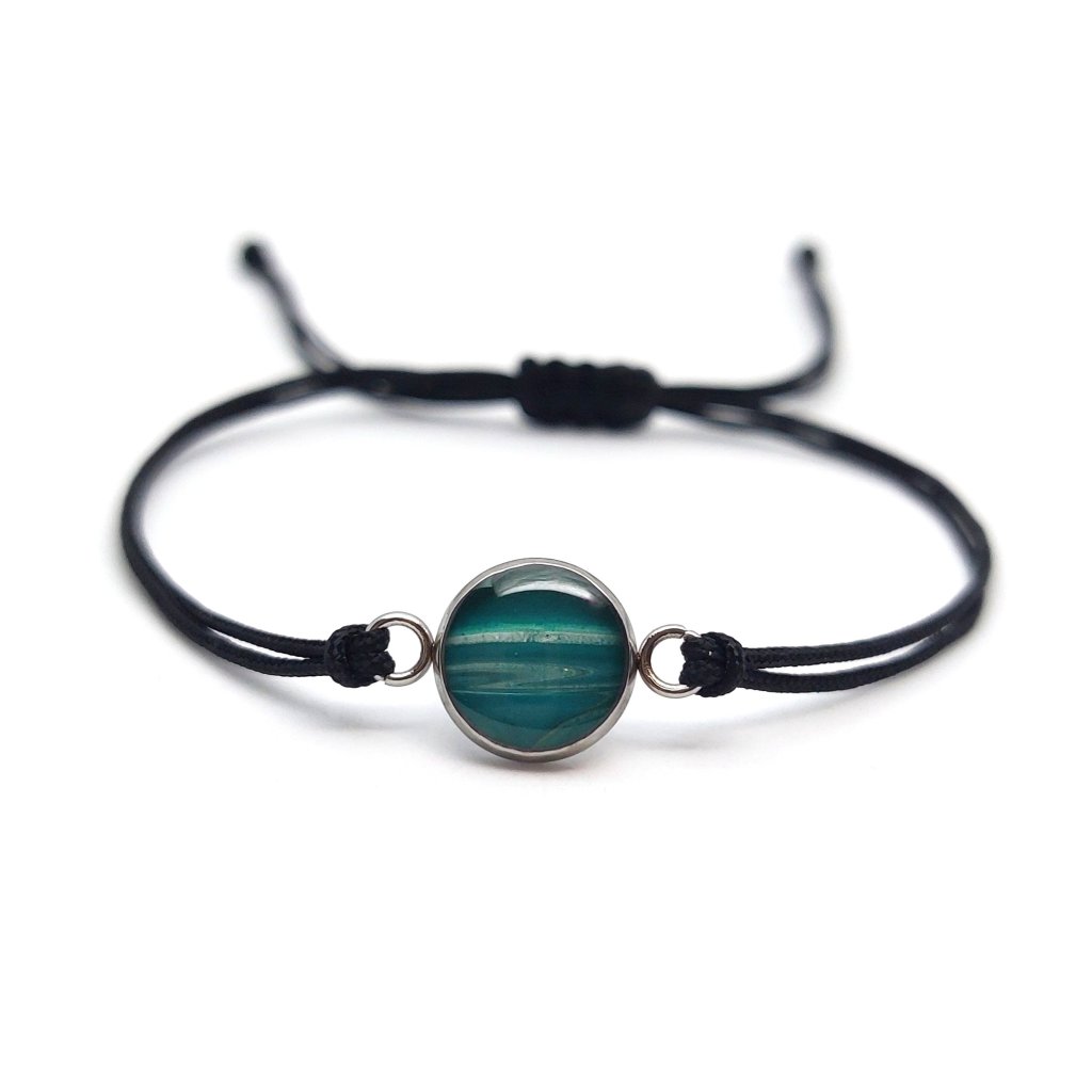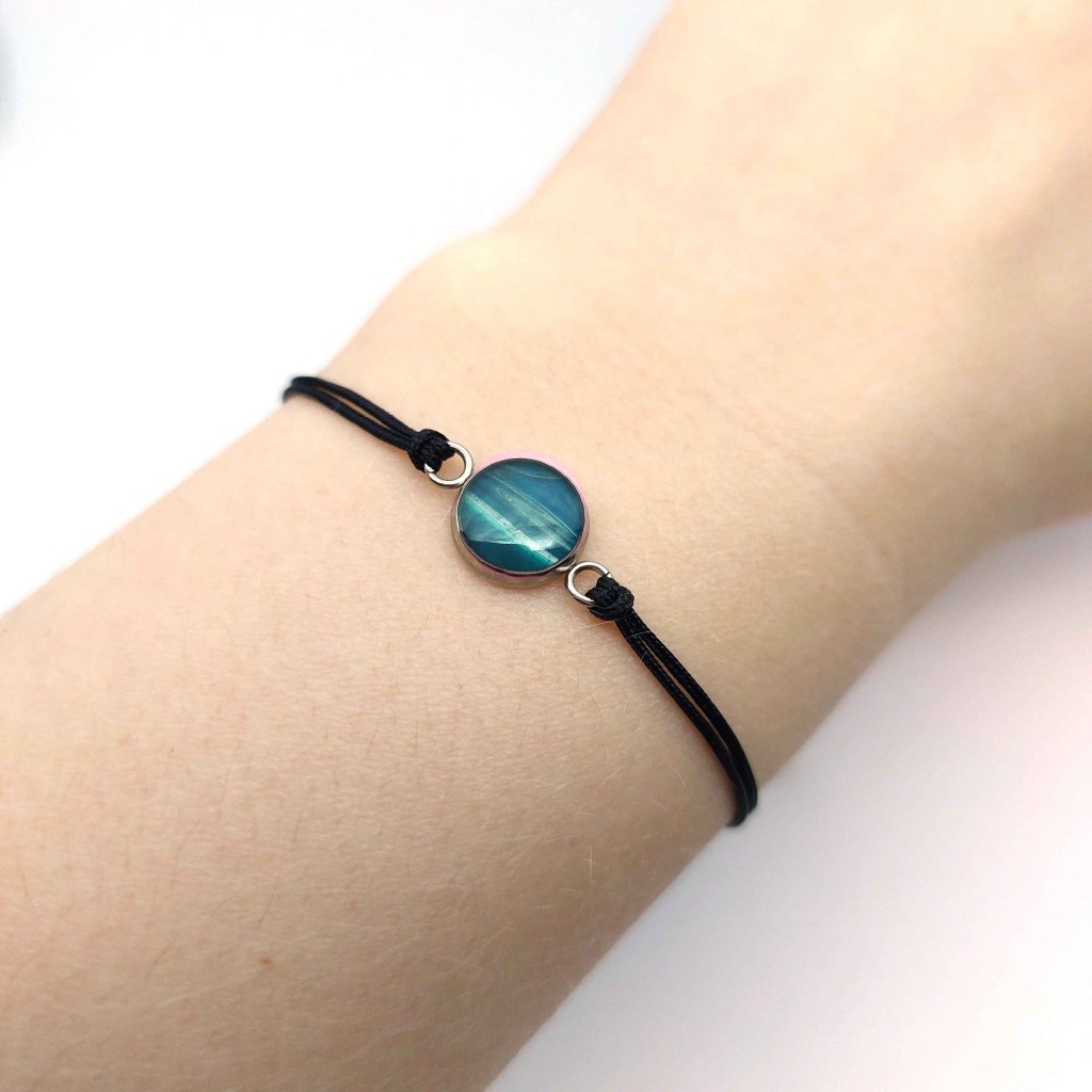 Ručně vyrobený náramek s přívěskem s petrolejovým abstraktním motivem zalitým pryskyřicí. Jeho vzor je jedinečný, nikdo nebude mít stejný jako vy.