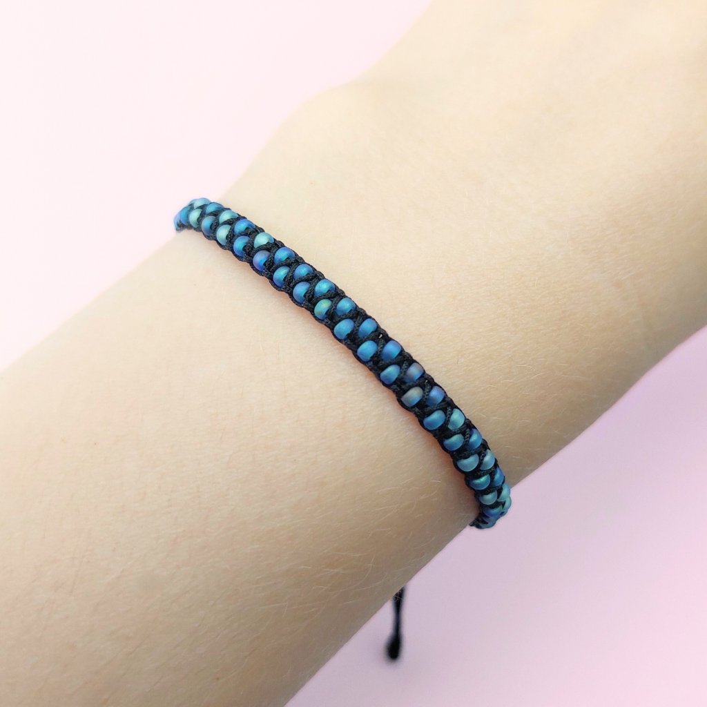 Ručně vyrobený náramek s drobnými modrými a šedými skleněnými korálky. Má nastavitelnou velikost, můžete ho povolovat a utahovat, jak je vám příjemné.