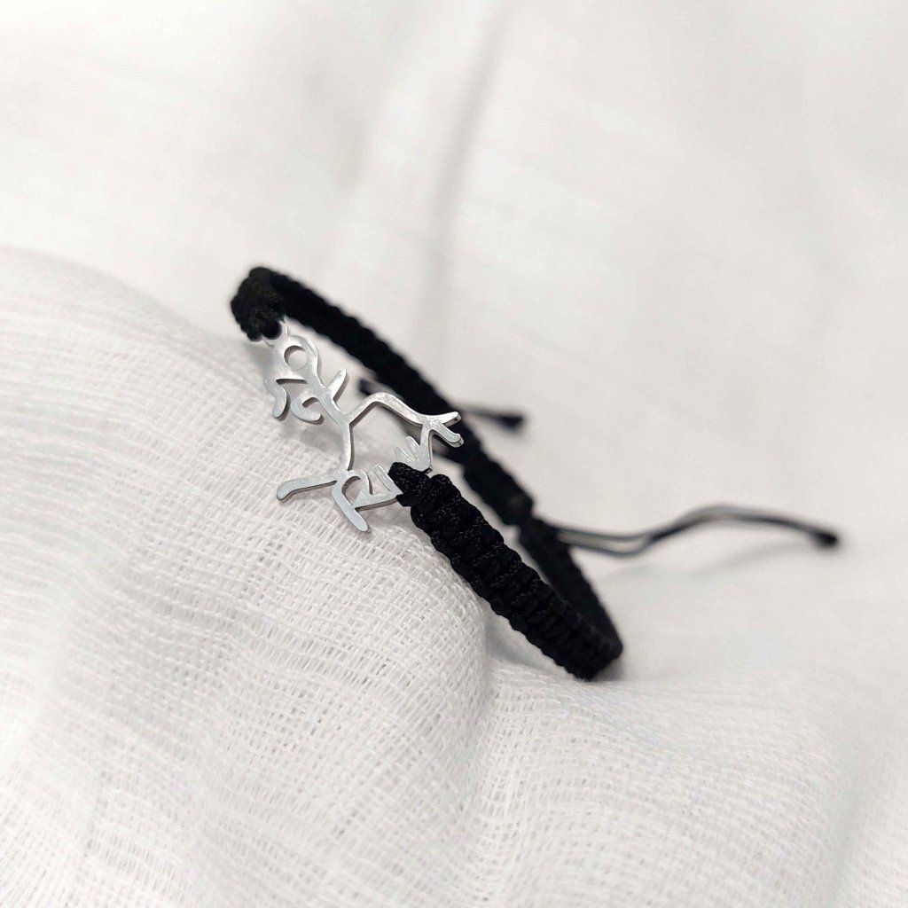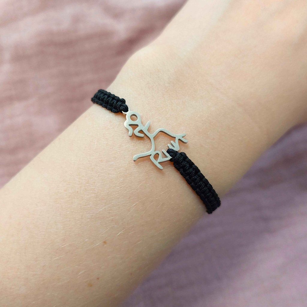 Ručně motaný náramek s přívěskem ve tvaru běžkyně z nerezové oceli. Dá se natahovat a povolovat, padne tak na každé zápěstí.