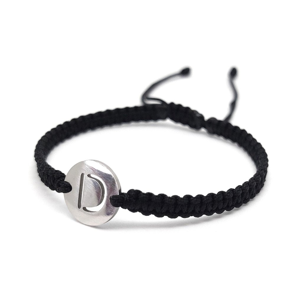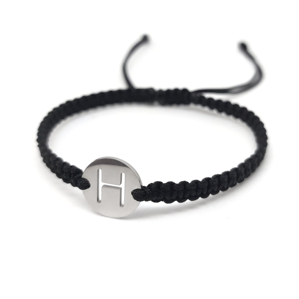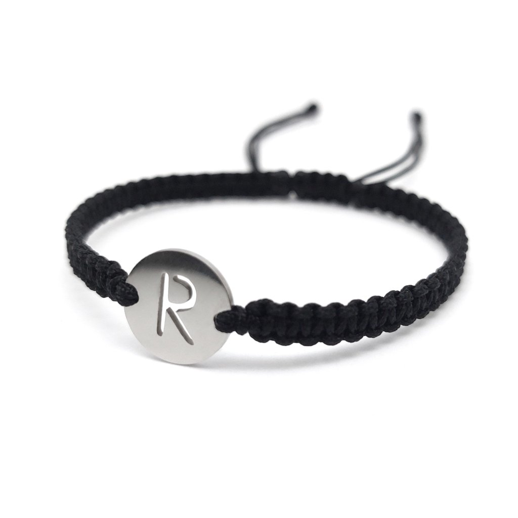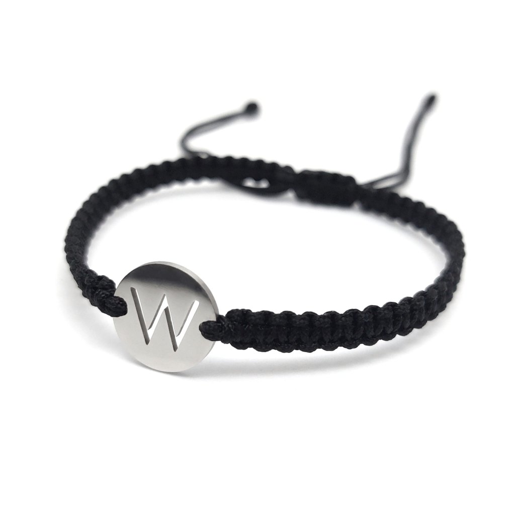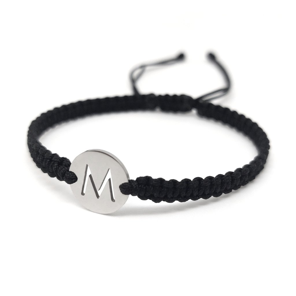 Ručně motaný náramek s ocelovým písmenkem. Je vyroben metodou macramé (drhání) a má nastavitelnou velikost, můžete si ho utahovat a povolovat tak, aby vám byl pohodlný.