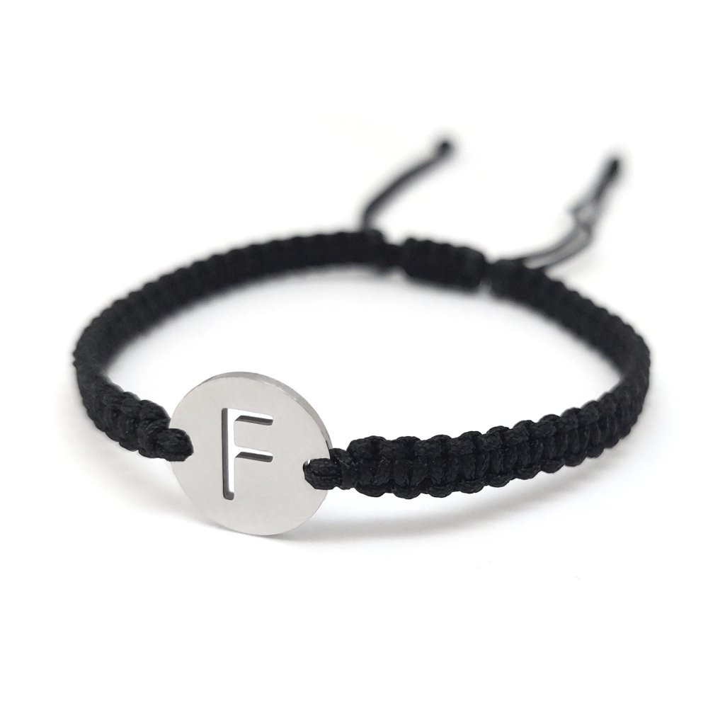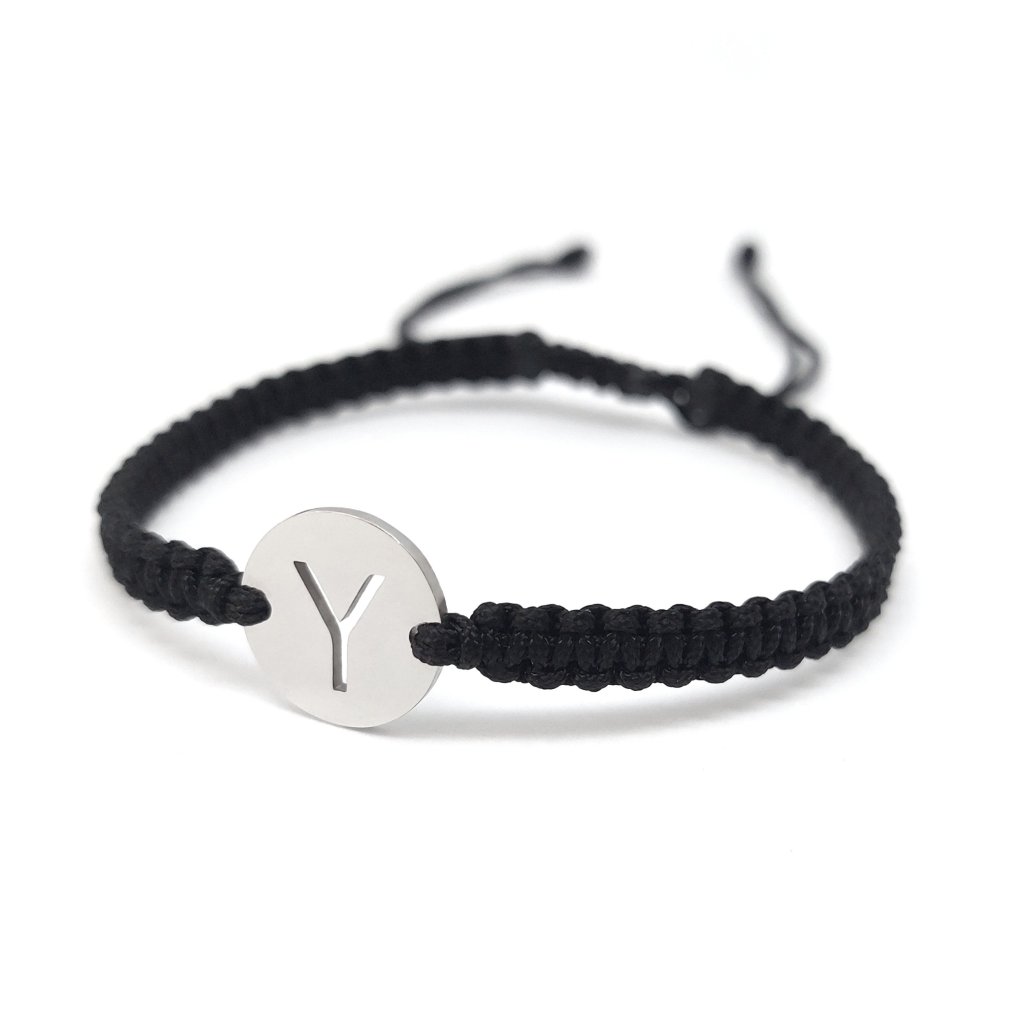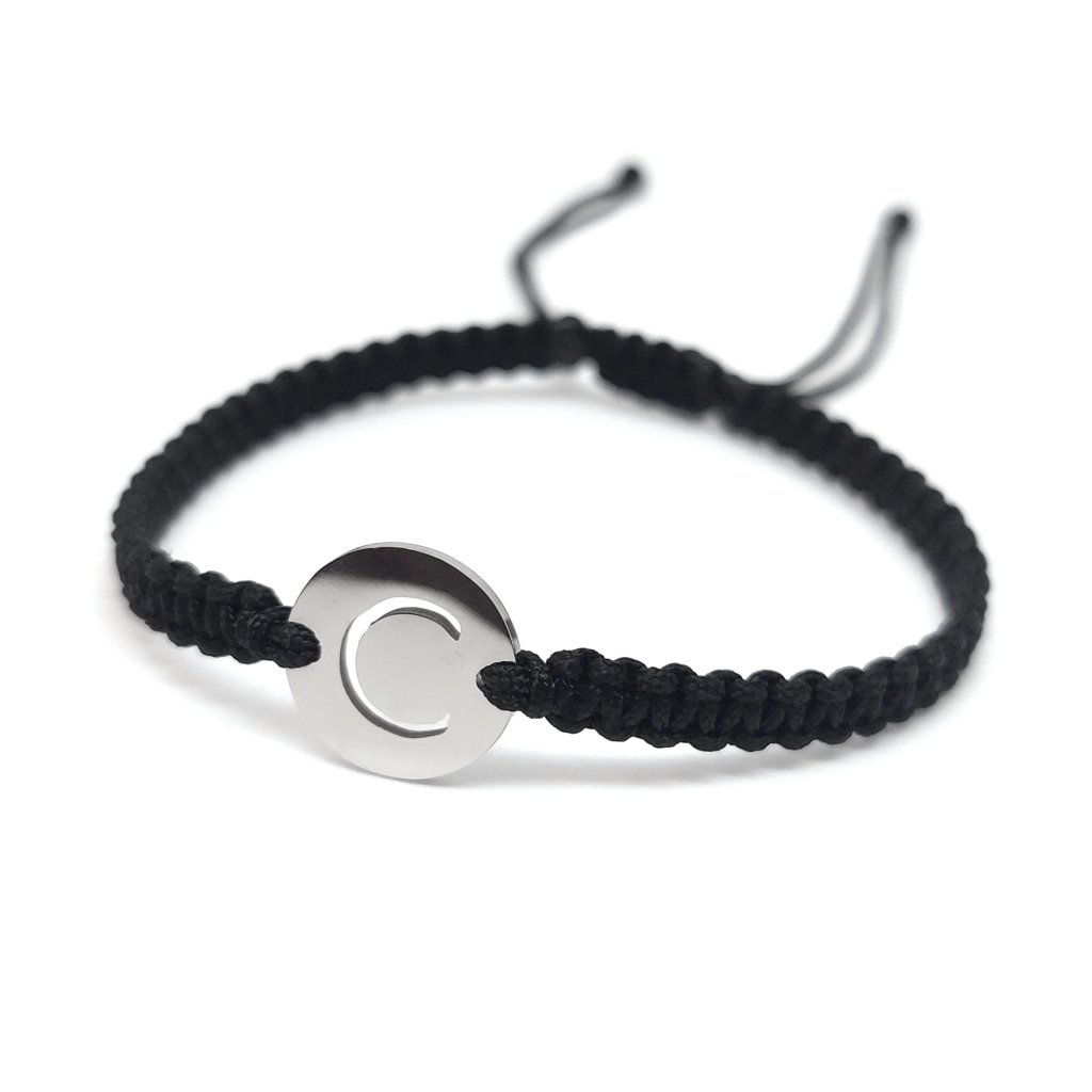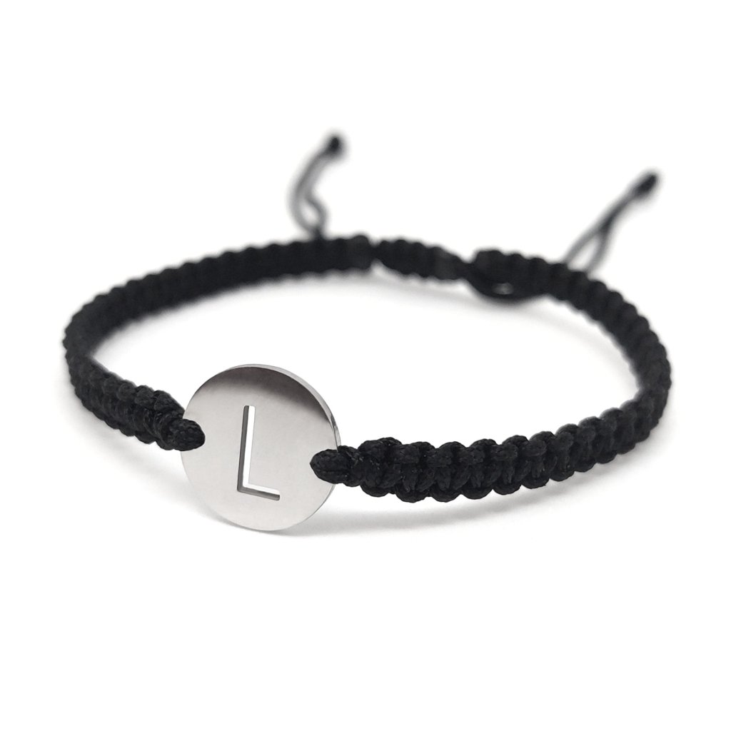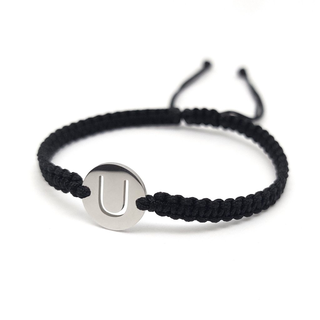 Ručně motaný náramek s ocelovým písmenkem. Je vyroben metodou macramé (drhání) a má nastavitelnou velikost, můžete si ho utahovat a povolovat tak, aby vám byl pohodlný.