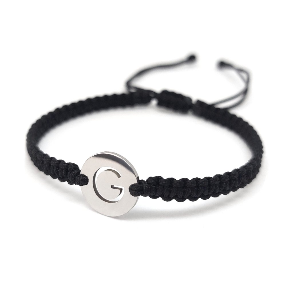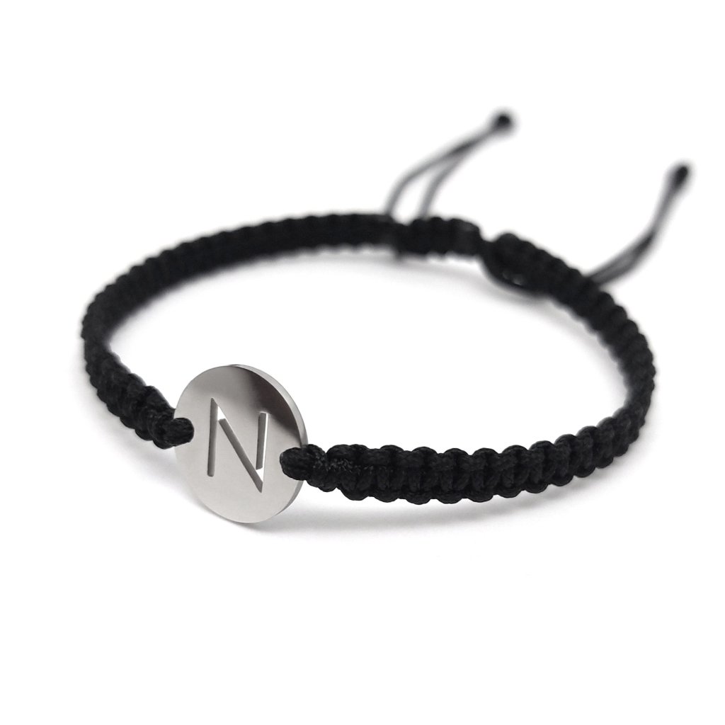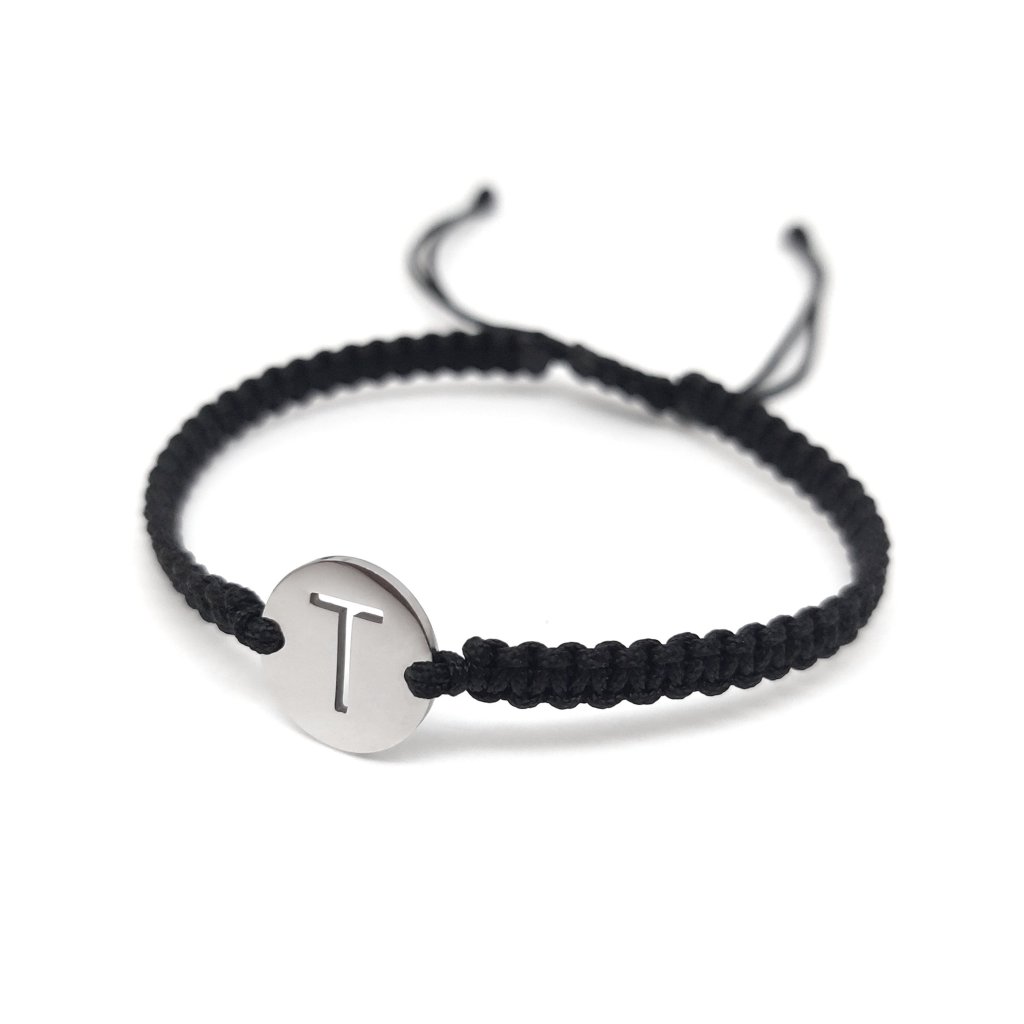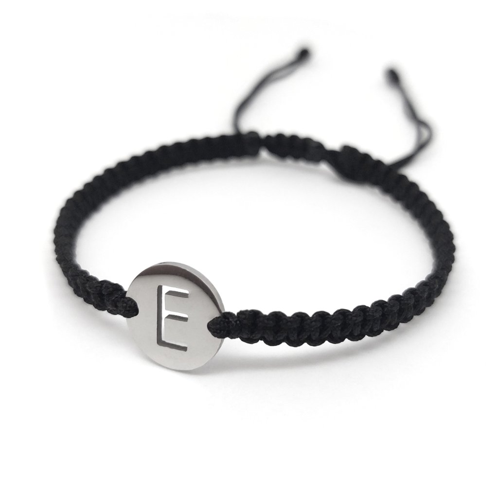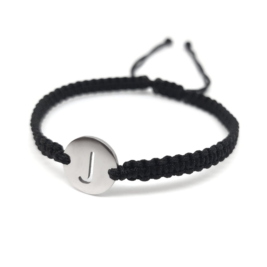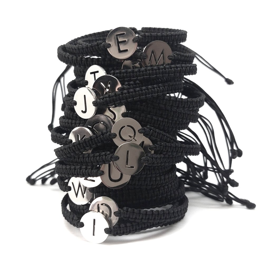 Ručně motaný náramek s ocelovým písmenkem. Je vyroben metodou macramé (drhání) a má nastavitelnou velikost, můžete si ho utahovat a povolovat tak, aby vám byl pohodlný.