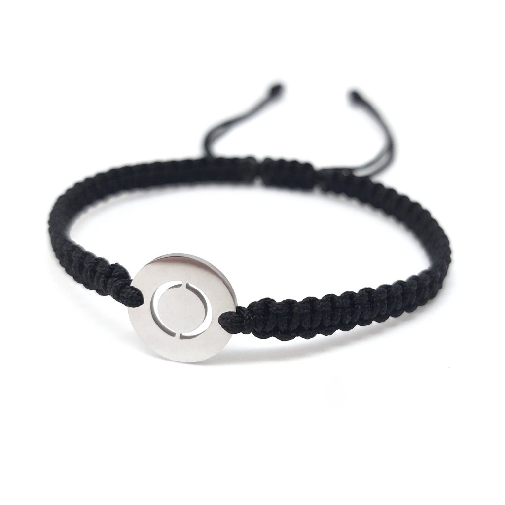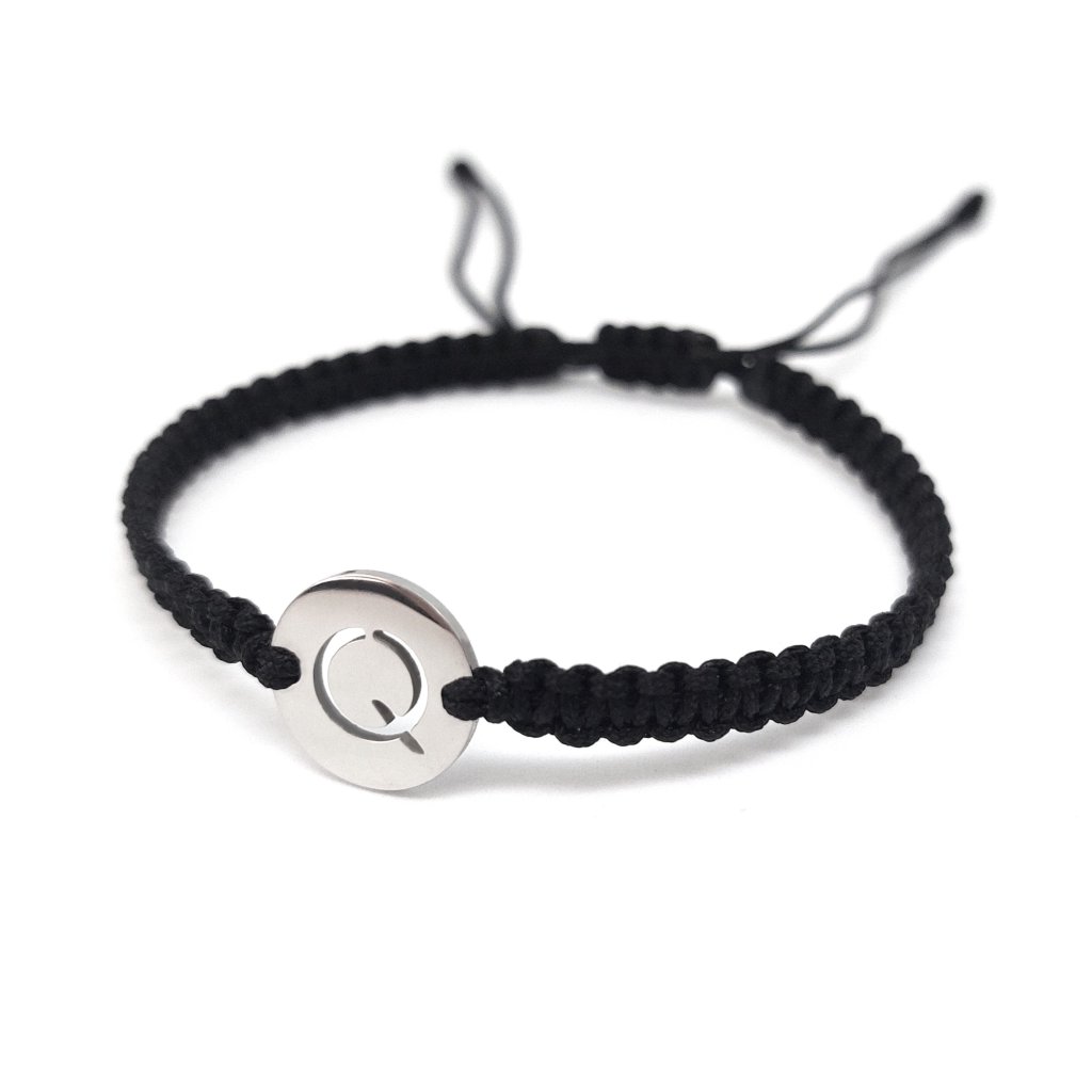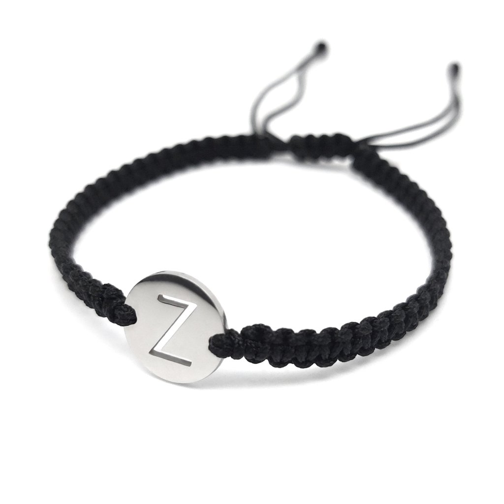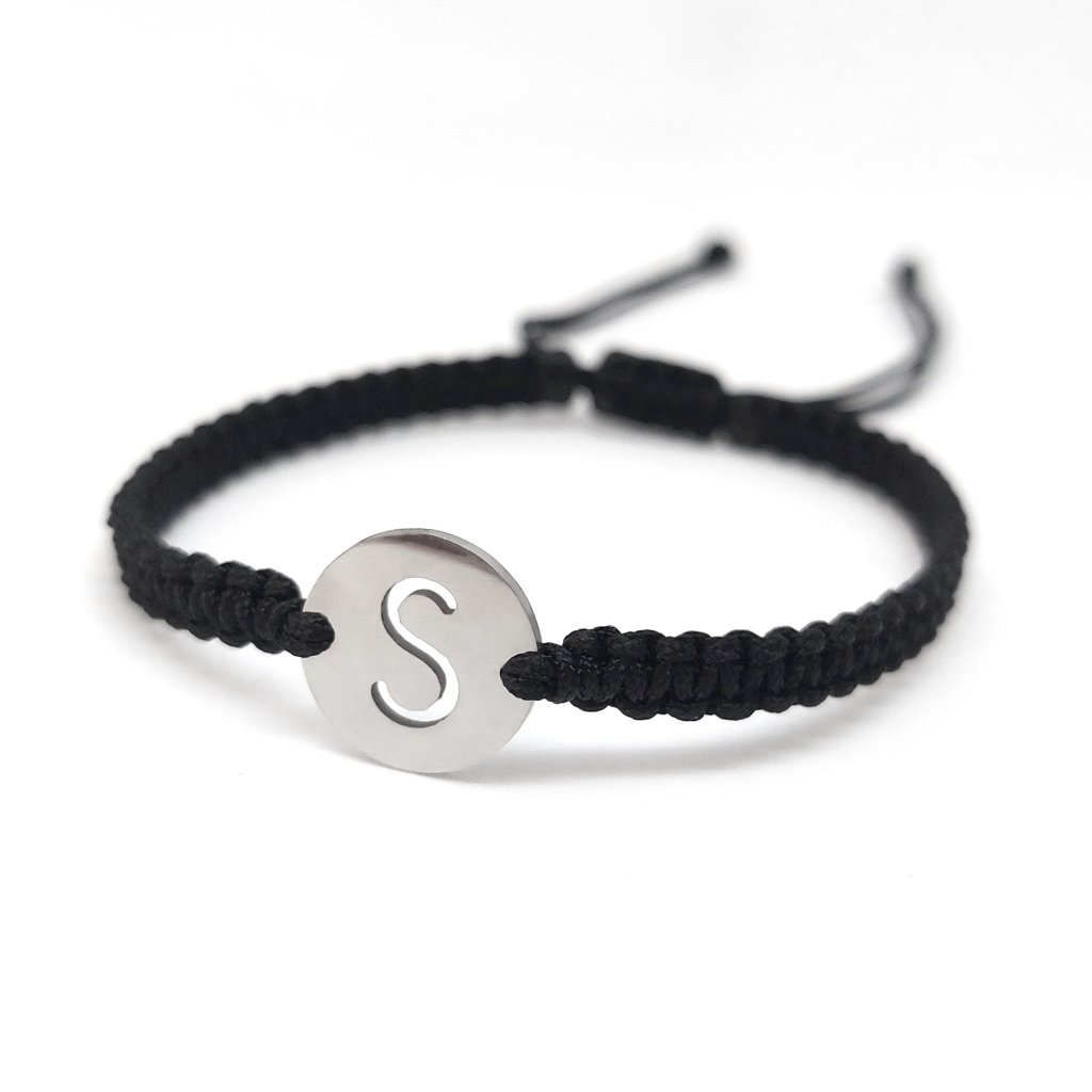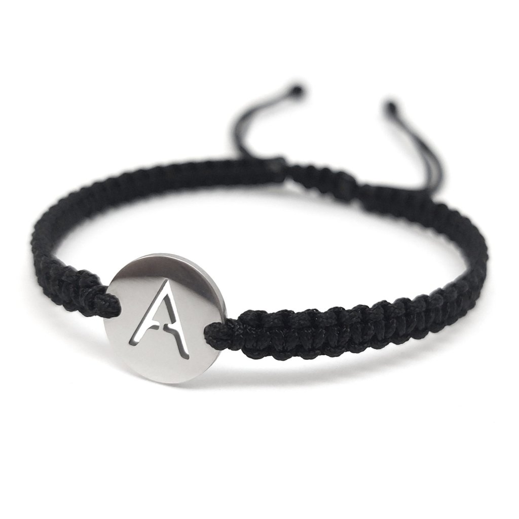 Ručně motaný náramek s ocelovým písmenkem. Je vyroben metodou macramé (drhání) a má nastavitelnou velikost, můžete si ho utahovat a povolovat tak, aby vám byl pohodlný.