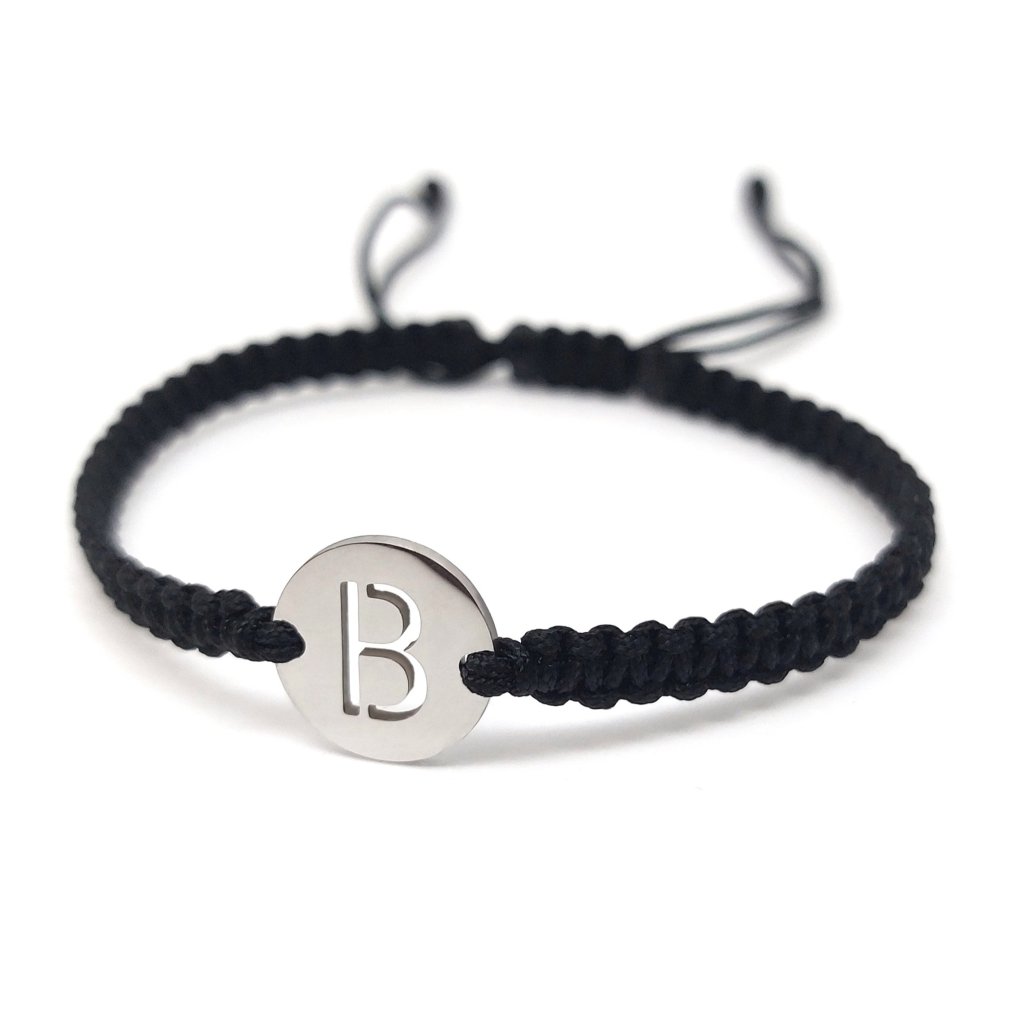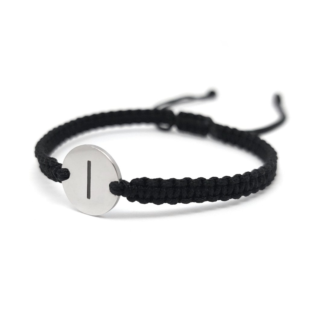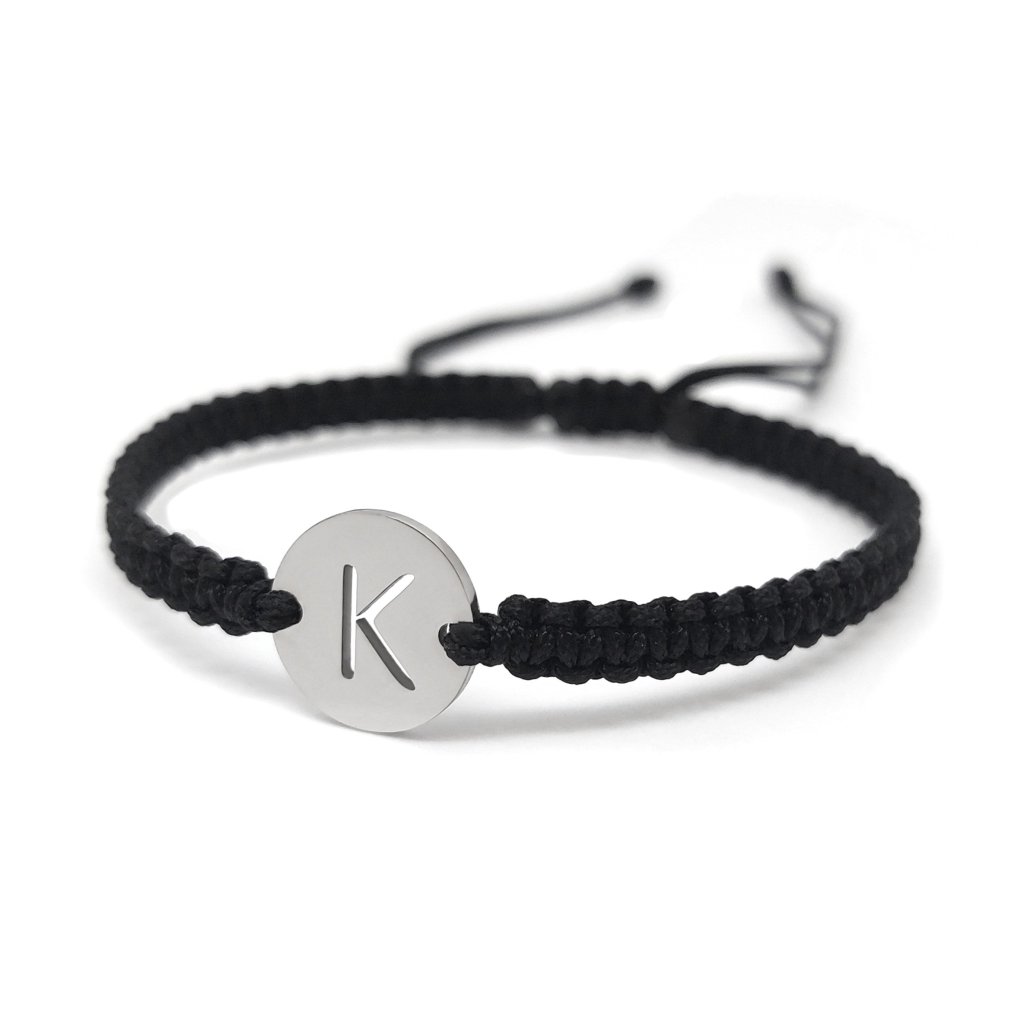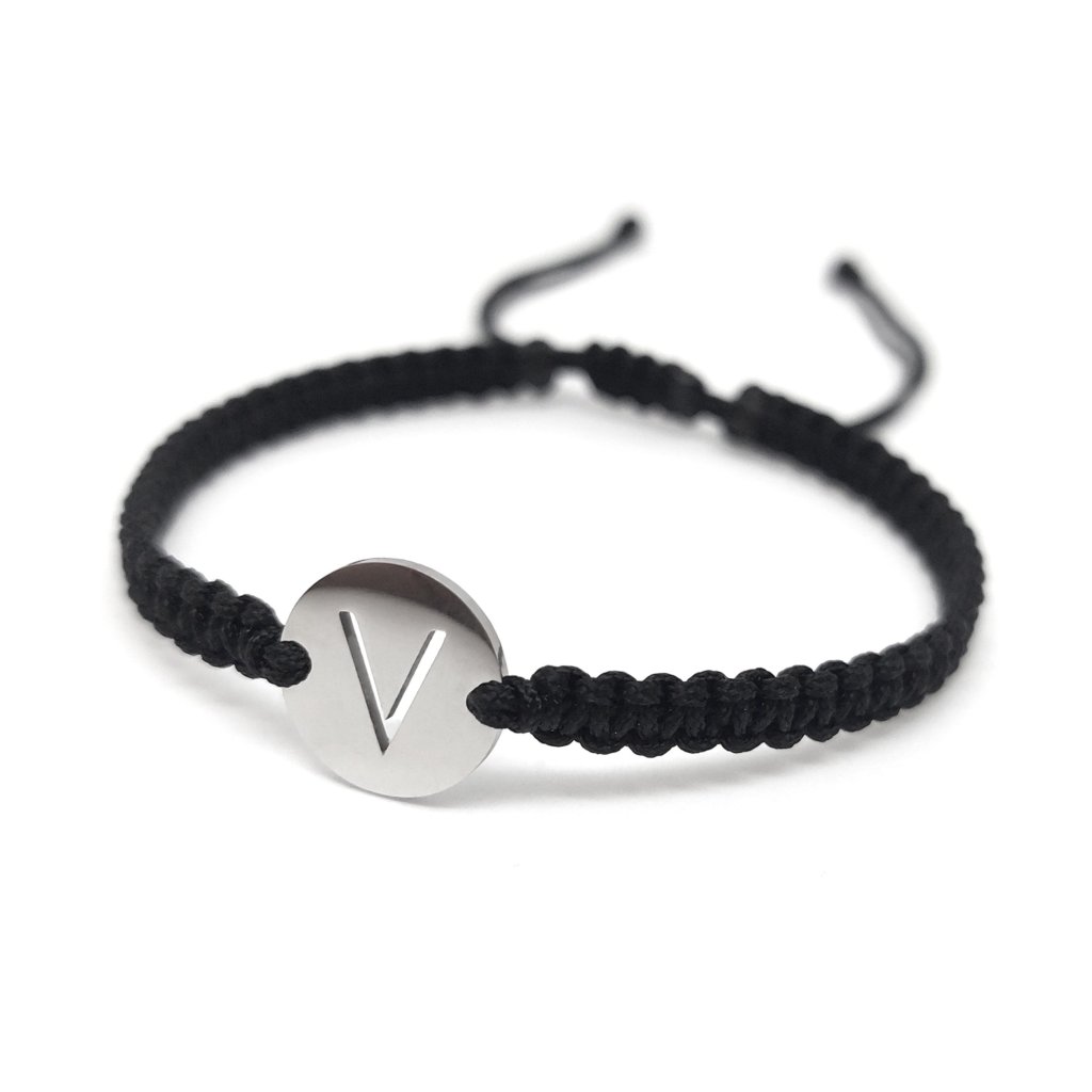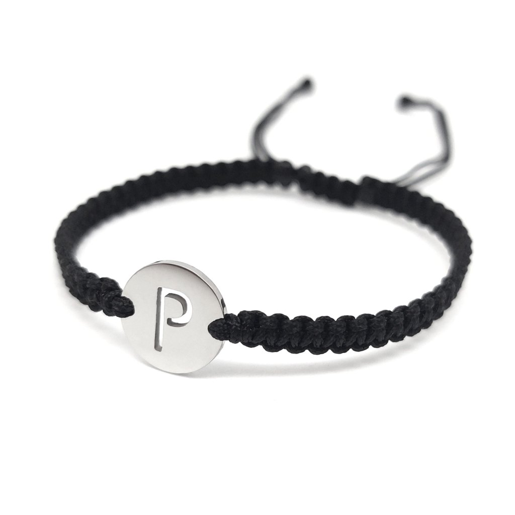 Ručně motaný náramek s ocelovým písmenkem. Je vyroben metodou macramé (drhání) a má nastavitelnou velikost, můžete si ho utahovat a povolovat tak, aby vám byl pohodlný.