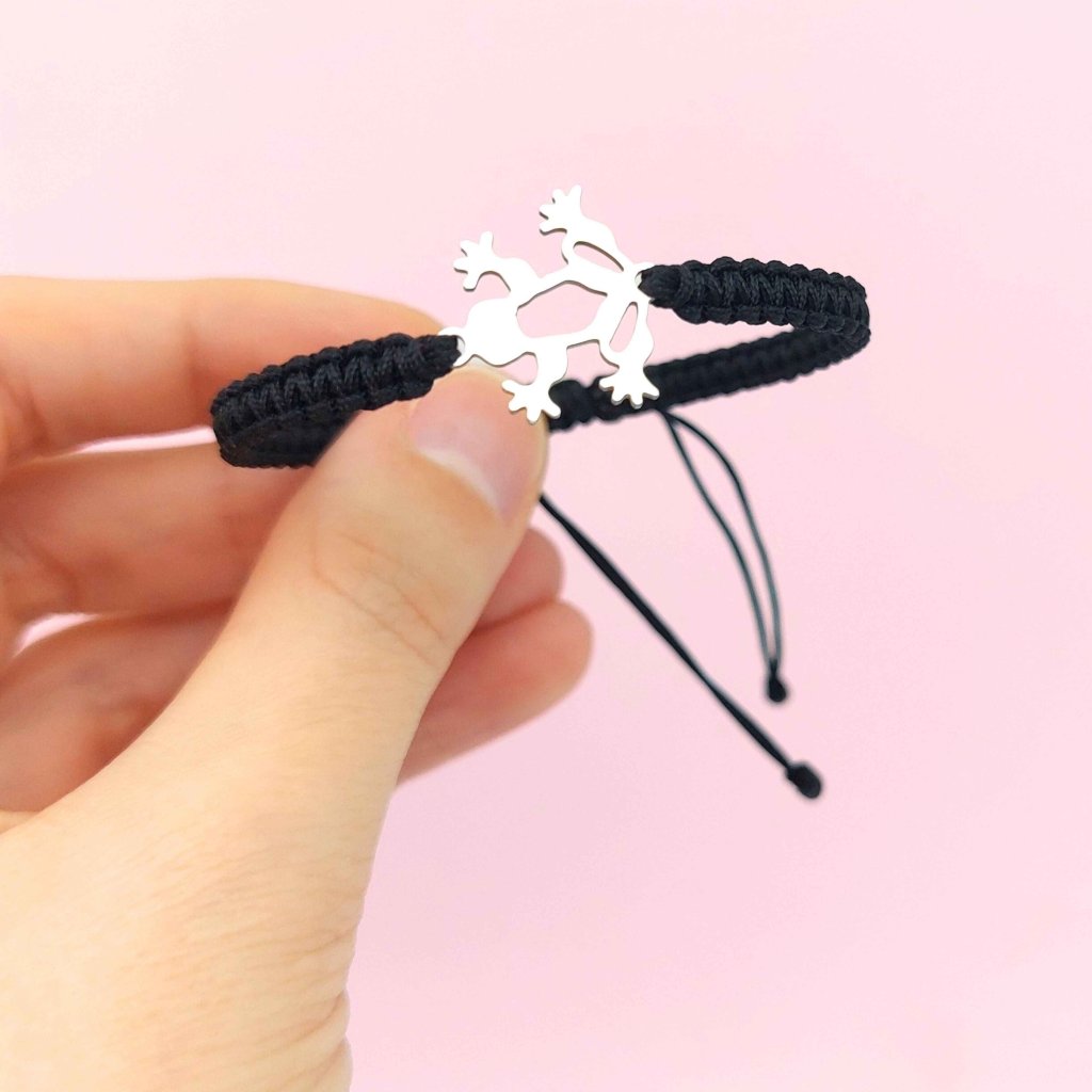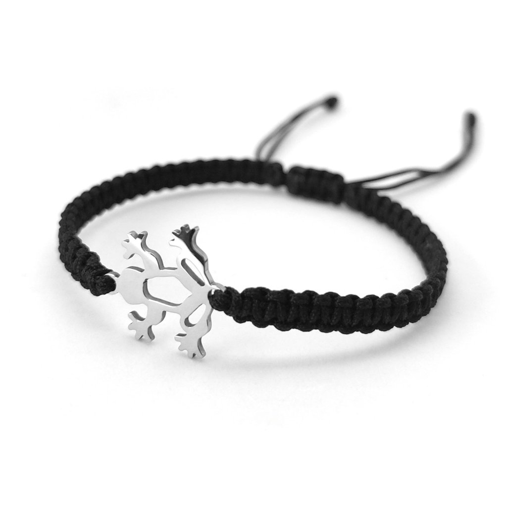 Ručně motaný náramek s žabkou z chirurgické oceli, náramek díky tomu můžou nosit i alergici na běžné bižuterní kovy.