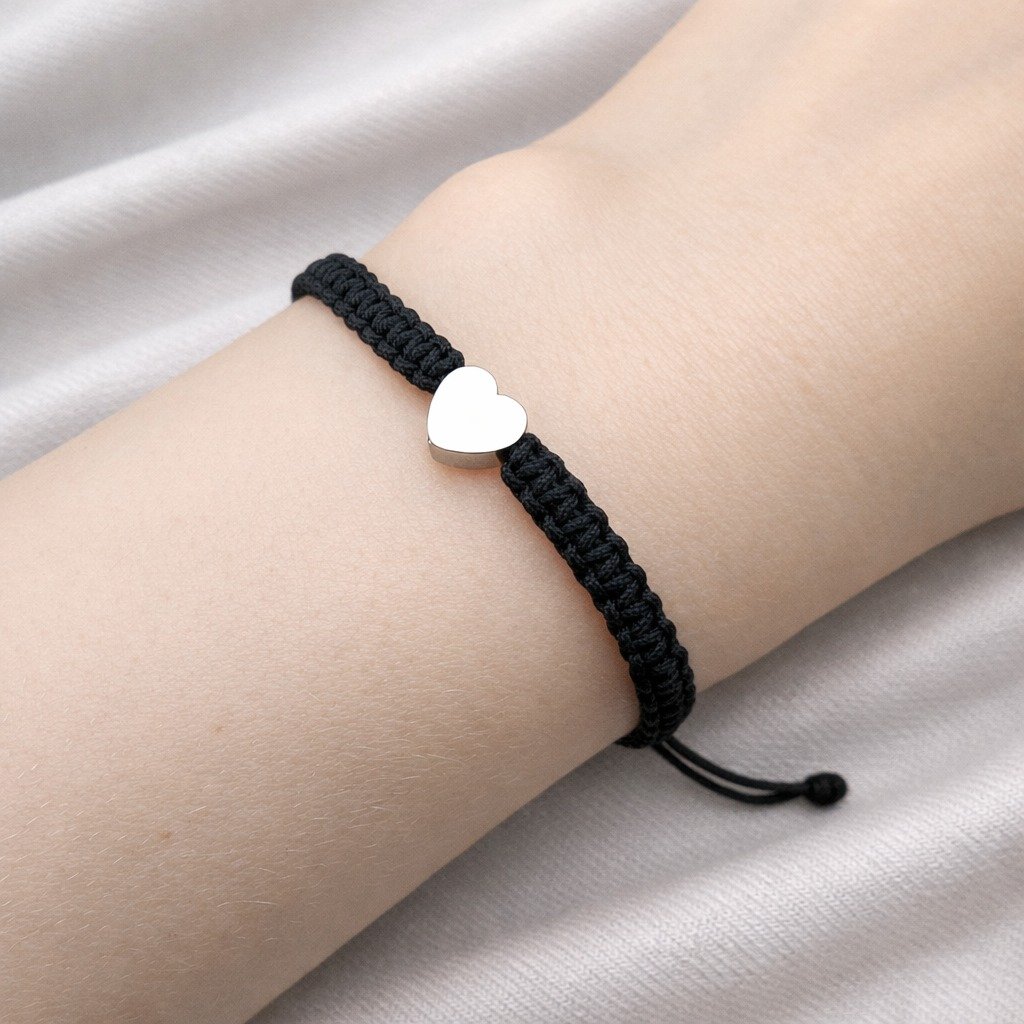 Ručně vyrobený náramek se srdíčkem. Srdíčko je z chirurgické oceli, náramek tak můžou nosit i alergici na běžné kovy. Díky posuvným uzlíkům si ho můžete utahovat a povolovat.