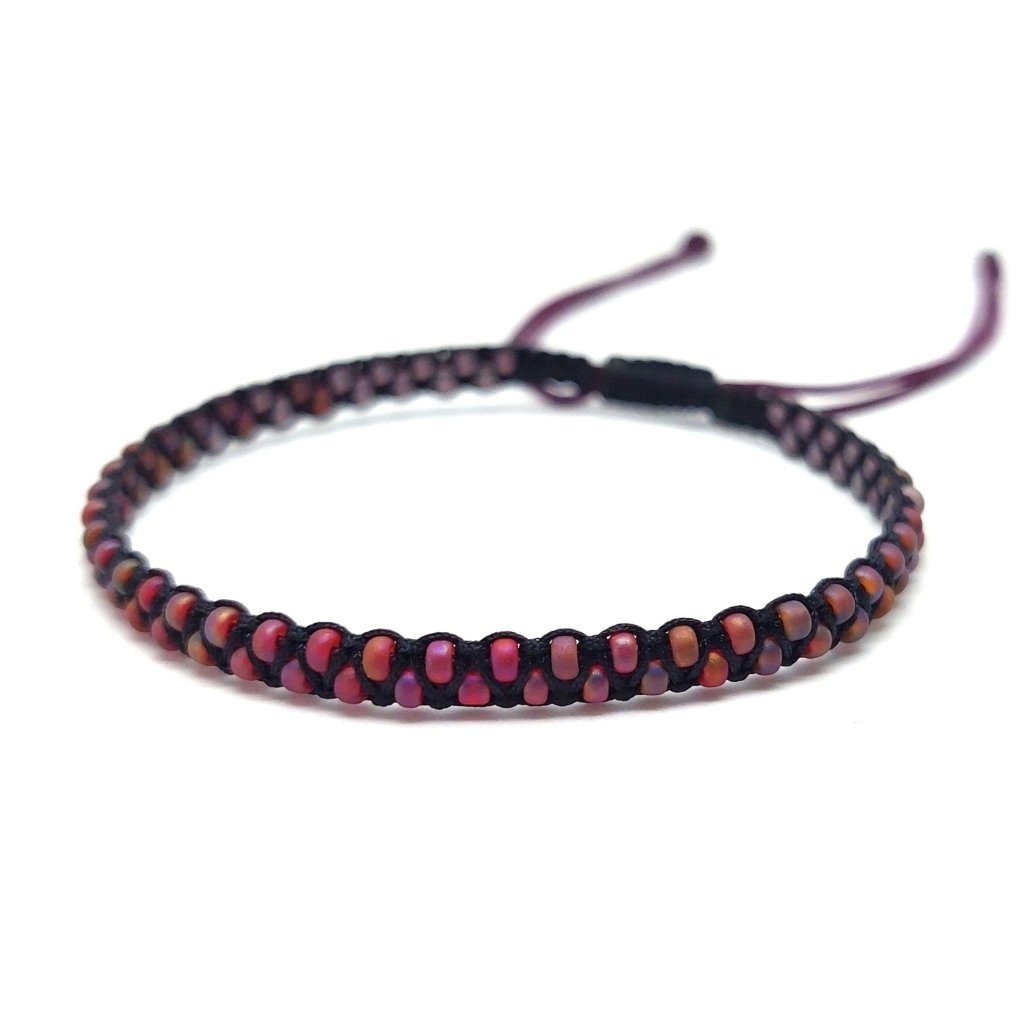 Ručně vyrobený náramek s drobnými růžovými a fialovými skleněnými korálky s oranžovými odlesky. Má nastavitelnou velikost, můžete ho povolovat a utahovat, jak je vám příjemné.