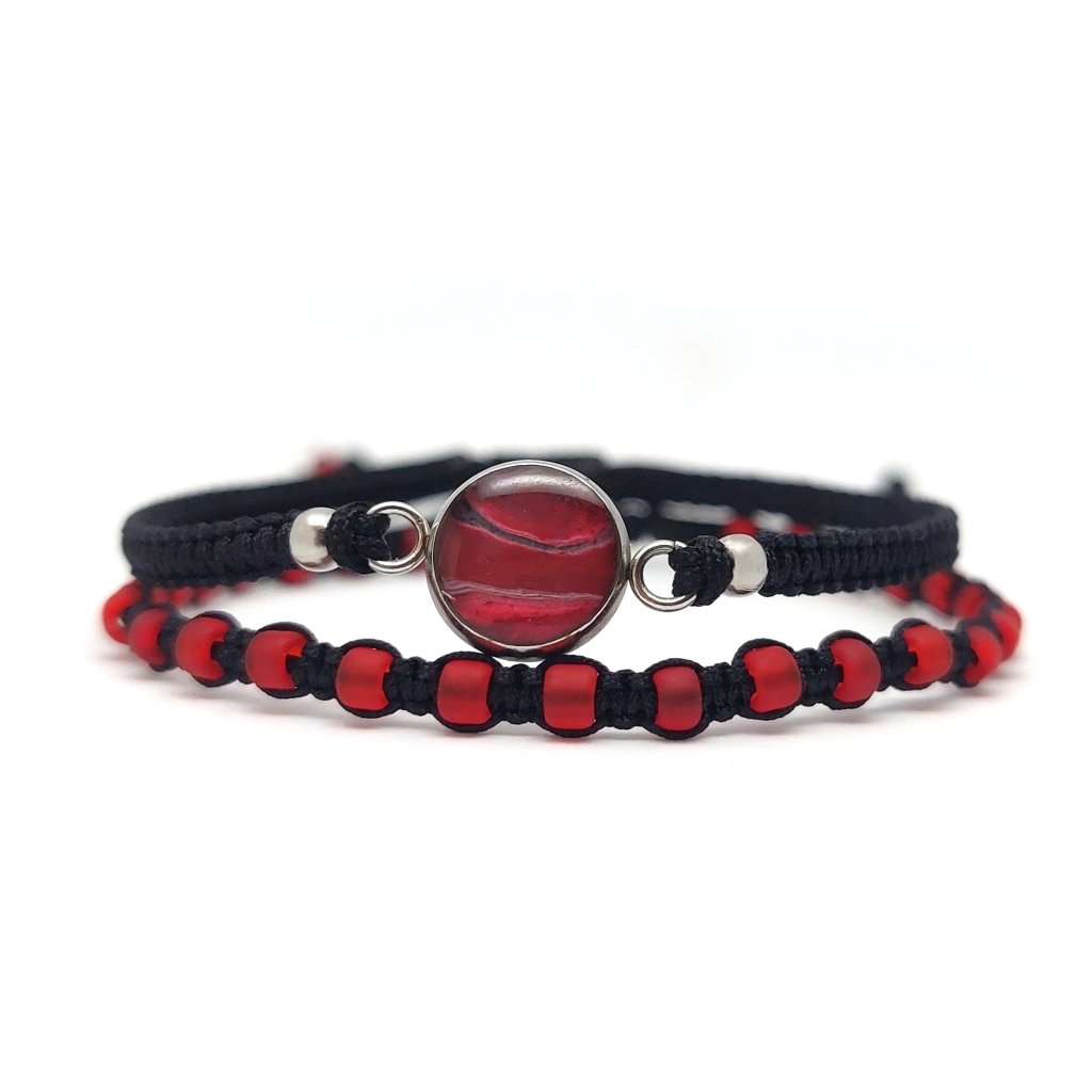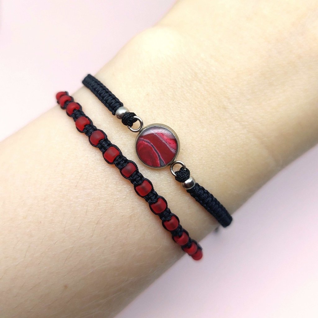Dvojice jemných ručně vyrobených červených náramků. První je s drobným přívěskem, druhý se skleněnými korálky. Vypadají velmi dobře společně, ale krásně vyniknou i samostatně.