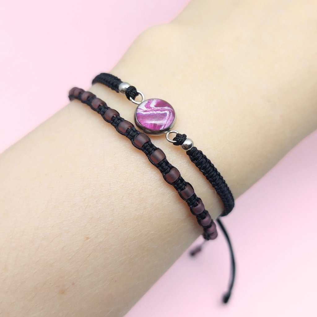 Dvojice jemných ručně vyrobených fialových náramků. První je s drobným přívěskem, druhý se skleněnými korálky. Vypadají velmi dobře společně, ale krásně vyniknou i samostatně.