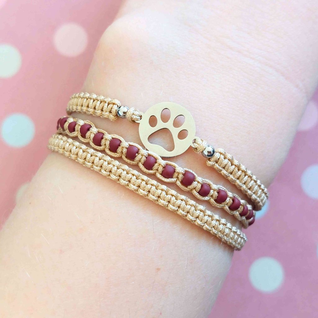 Sada tří béžových macramé náramků. Jeden je s ocelovou tlapkou, druhý se skleněnými korálky a třetí je minimalistický, jen ze šňůrky.
