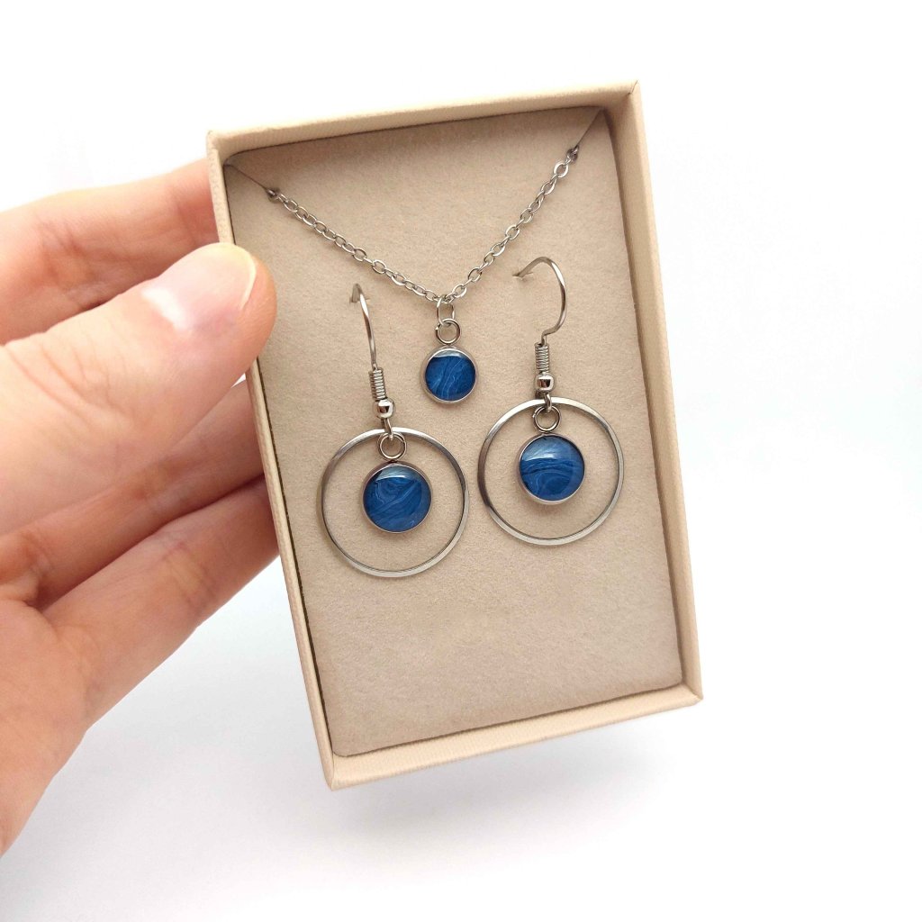 Sada ručně vyrobených modrých šperků - náhrdelník a visací náušnice.