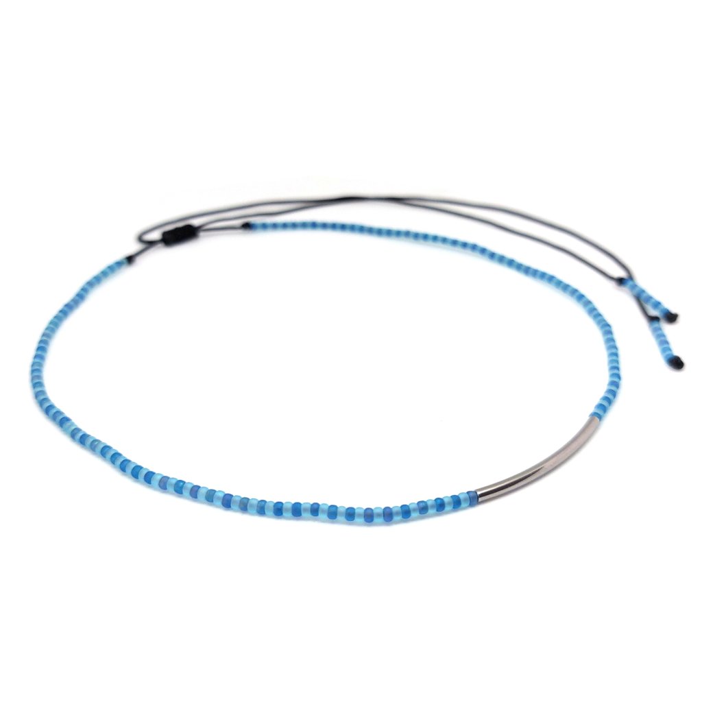 Ručně vyrobený tenký modrý náhrdelník ze skleněných korálků Miyuki (vysoce kvalitní japonské korálky) s ocelovou trubičkou.