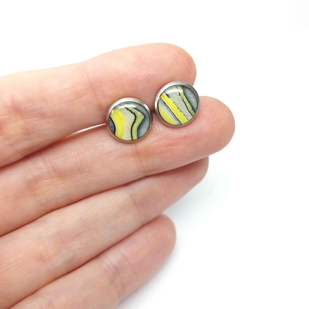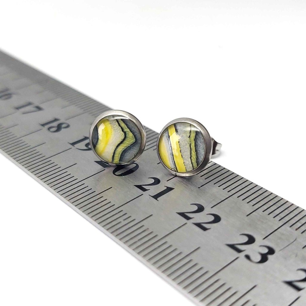 Drobné žluté malované pecky z chirurgické oceli - motiv náušnic vznikl metodou acrylic pouring (lití akrylu). Výsledek této techniky je pokaždé jiný, šperky tak jsou jedinečné, nikdo nebude mít stejné jako vy. Motiv je zalitý pryskyřicí, která vypadá jako sklo, ale je mnohem lehčí.